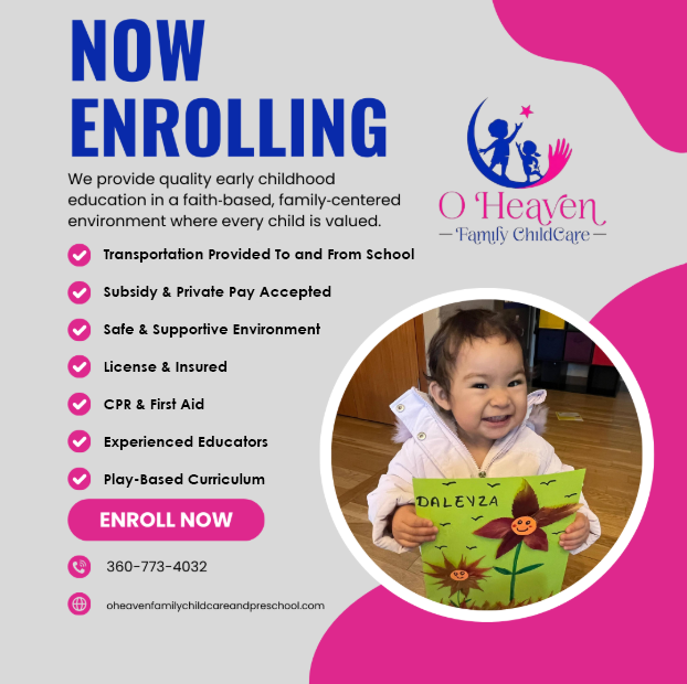 Welcome to O Heaven Family Childcare & Preschool in Vancouver, WA! Our agency provides exceptional childcare services for children aged 6 weeks to 12 years. We offer specialized programs like infant care, toddler care, preschool, and care for school-age children. With options for school pick-up and drop-off services for school-aged children, we aim to make childcare convenient for families. Our affordable pricing and flexible payment plans make quality childcare accessible to all. Trust O Heaven Family Childcare & Preschool for a nurturing and educational environment for your little ones!